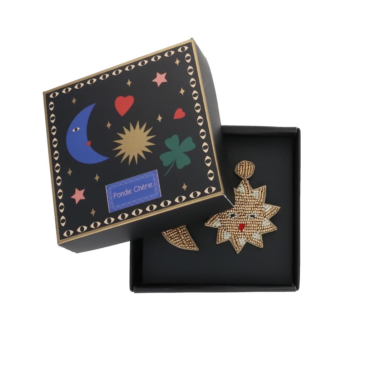 Les boucles d’oreilles en perles soleil et lune symbolisent l’équilibre parfait entre lumière et douceur, jour et nuit.