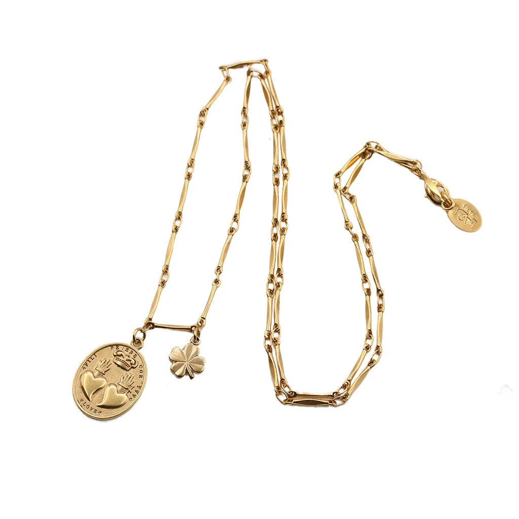 Collier en laiton bain d’or, 1 micron d’or 999/1000, double cœur et pampille trèfle. Longueur de la chaine 55 cm. Médaille double cœur 2 cm / 1,5 cm.