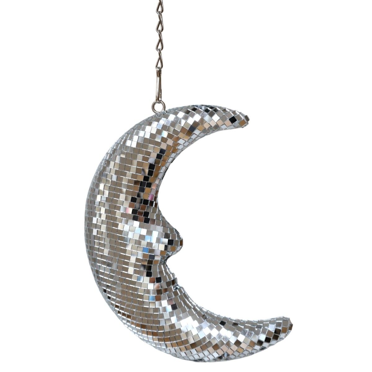 Avec sa surface entièrement recouverte de facettes argentées, ce croissant de lune capte la lumière naturelle ou artificielle pour la diffuser en mille reflets scintillants du sol au plafond. Livrée avec une chaînette de 45 cm, elle se suspend facilement au plafond, près d’une fenêtre ou dans un coin déco.