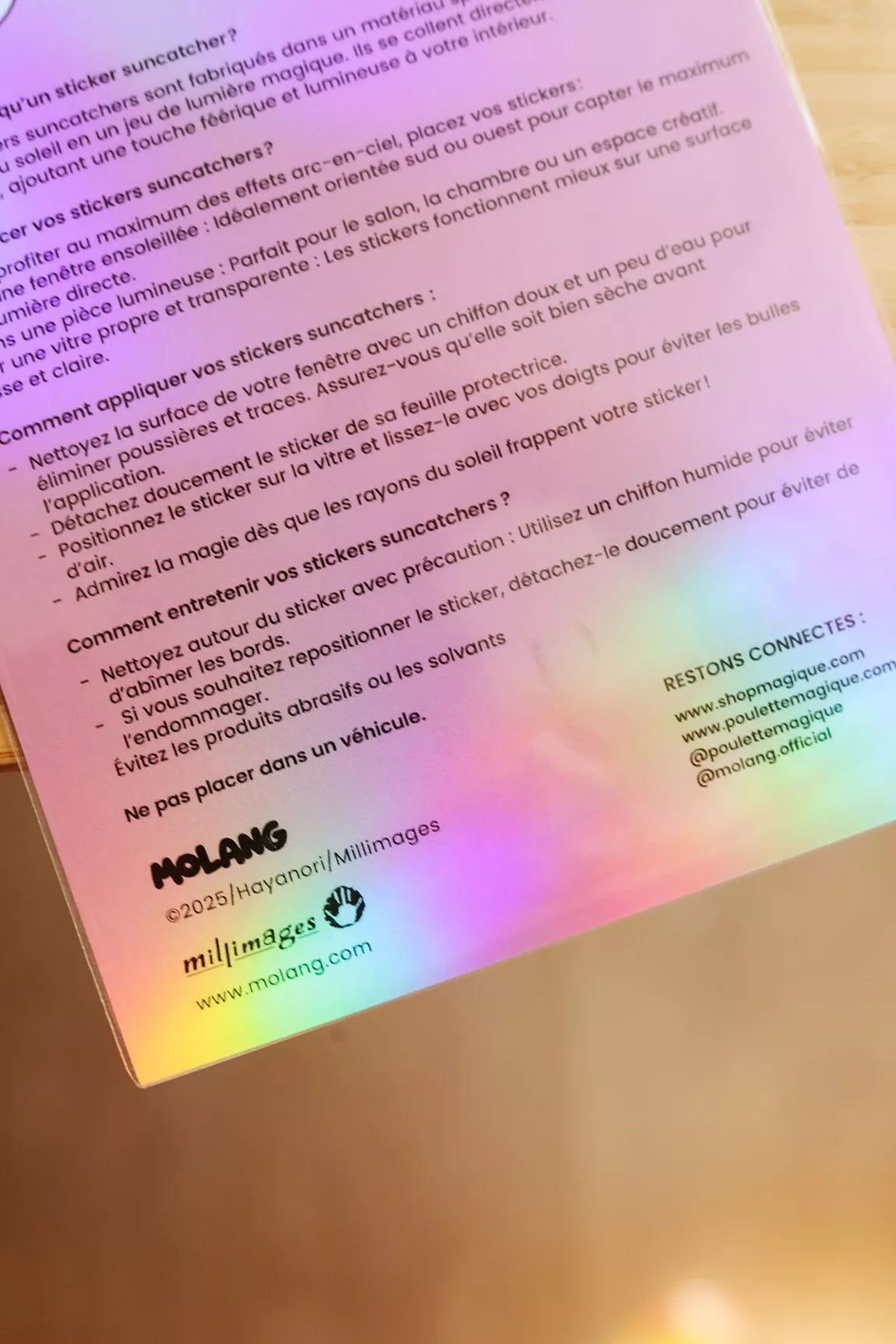 Facile à appliquer et à repositionner, ce suncatcher adhésif Molang se colle directement sur vos vitres, baies vitrées ou miroirs. Il ne laisse aucune trace et peut être déplacé à volonté selon vos envies. C’est l’accessoire déco idéal pour égayer une chambre, un salon, un bureau ou même une voiture !