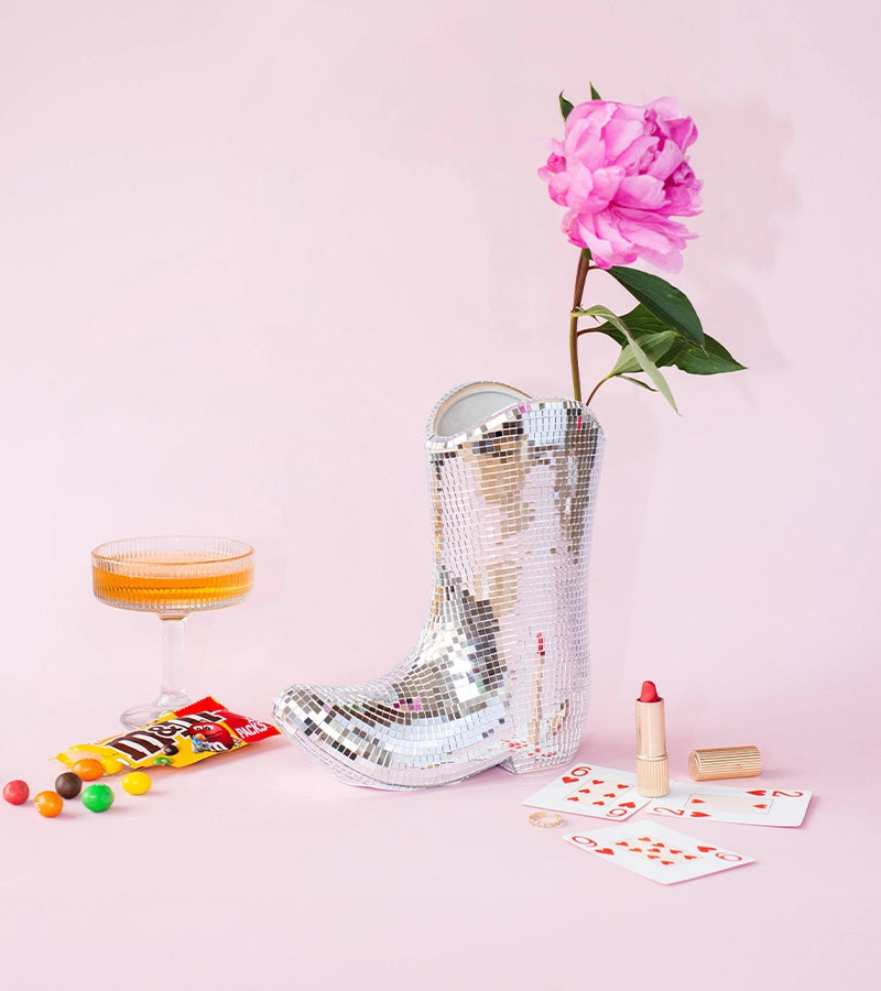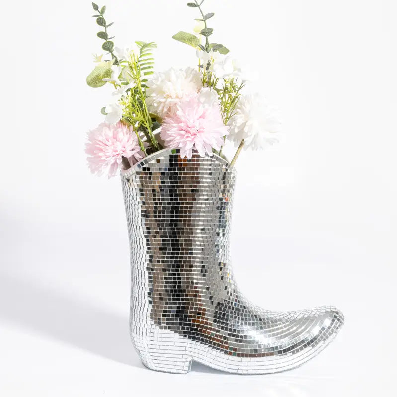 Laissez-vous séduire par l'éclat irrévérencieux de ce vase santiag, entièrement recouvert de mosaïques miroir. Véritable statement déco, il fusionne l'esprit rebelle du Far West avec l'énergie vibrante des soirées disco. Idéal pour accueillir un bouquet audacieux ou simplement briller en pièce maîtresse, ce vase transcende les conventions et célèbre l'excentricité avec panache. 🪩🤠 Vase Santiag disco Matière : céramique, facettes miroir Dimensions : 24cm x 22cm Fourni dans son packaging très résistant à la casse Fabriqué à la main Design exclusif L'expressionist©