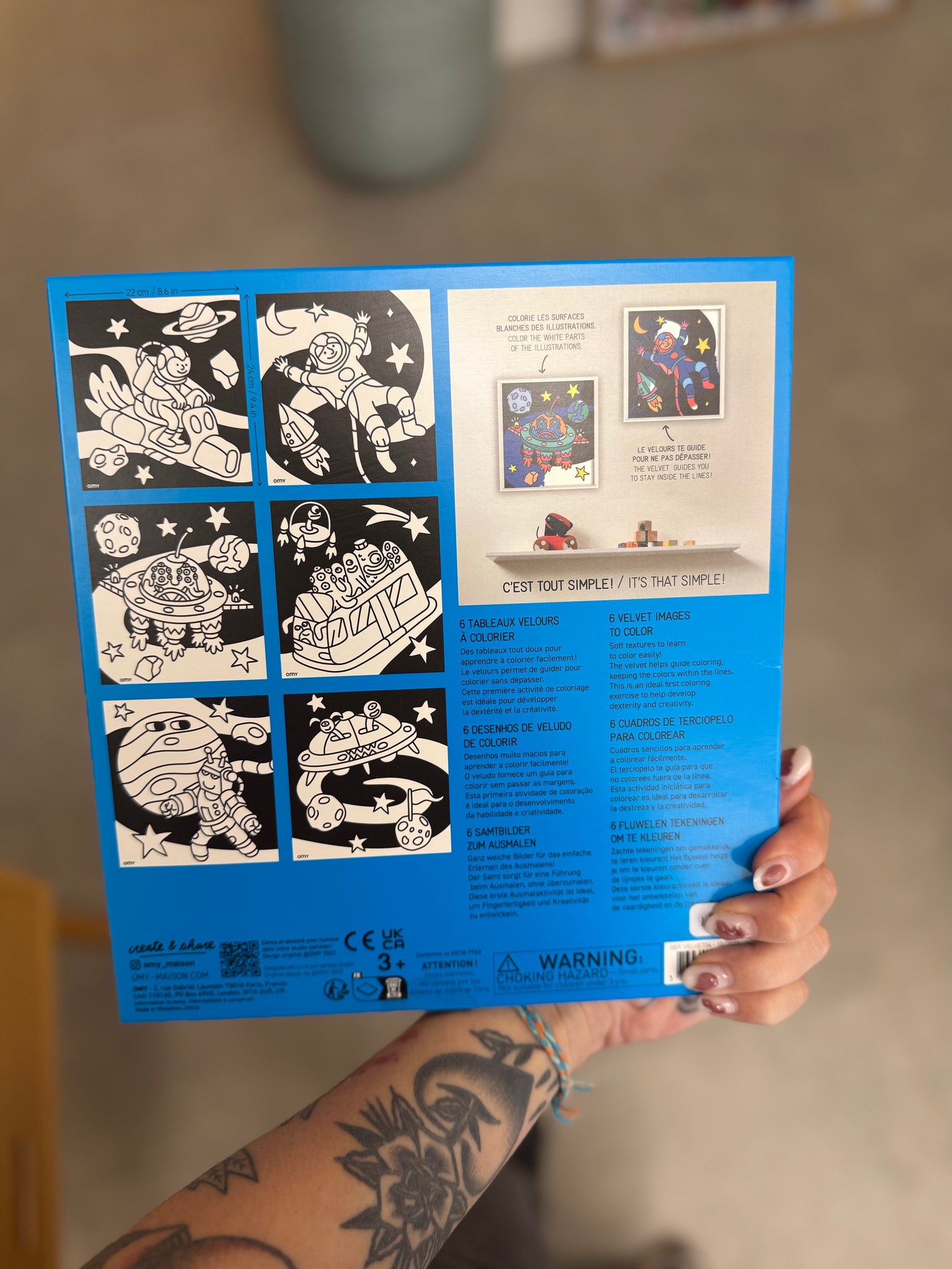 Le monde de l'espace s'invite sur 6 tableaux velours à colorier pour décorer la maison ou sa chambre avant le jour J.