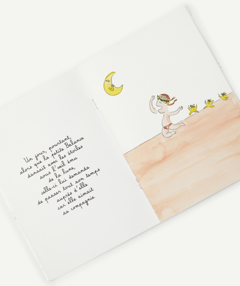 « Un jour, pourtant, alors que la petite Balance dansait avec les étoiles sous l’oeil ému de la lune, celle-ci lui demanda de passer tout son temps auprès d’elle car elle aimait sa compagnie. »