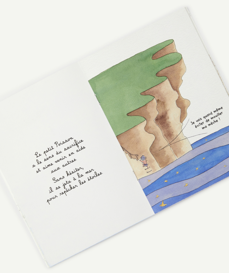 Le petit Poisson, sensible et rêveur, repense avec nostalgie à l’année passée quand tout à coup, Big Bang, les étoiles se décrochent du ciel et tombent dans l’eau…