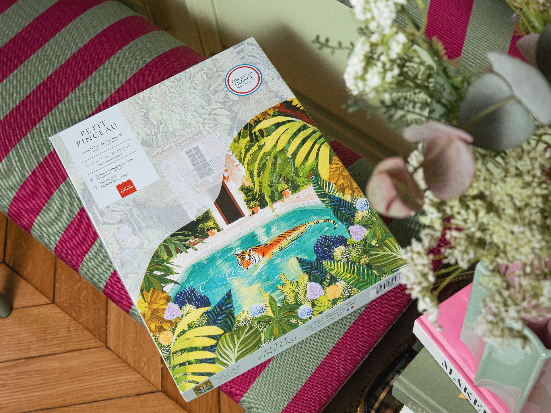 Partez pour un voyage tropical avec Tiger Relaxing In My Pool, la peinture au numéro imaginée par Studio Grand-Père (Rafaela Mascaro). Ce coffret complet et éco-responsable, fabriqué en France, vous invite à peindre un tigre flamboyant au bord d’une piscine dans une jungle luxuriante.