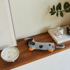 ORIGINAL DESIGN. The umbrella features a fun dog pattern. The sleeve is shaped like a dachshund, and the handle mimics the dog’s tail when closed.